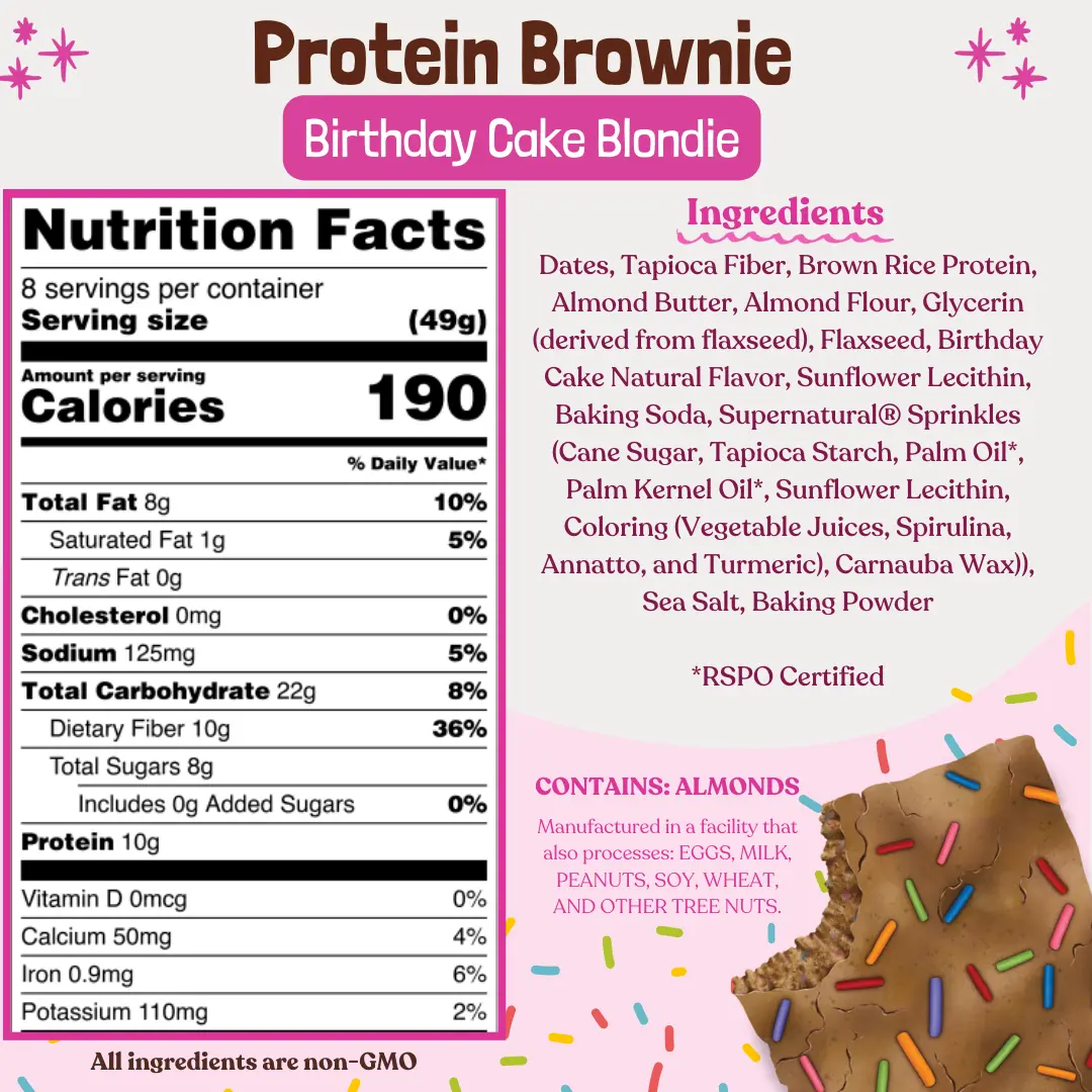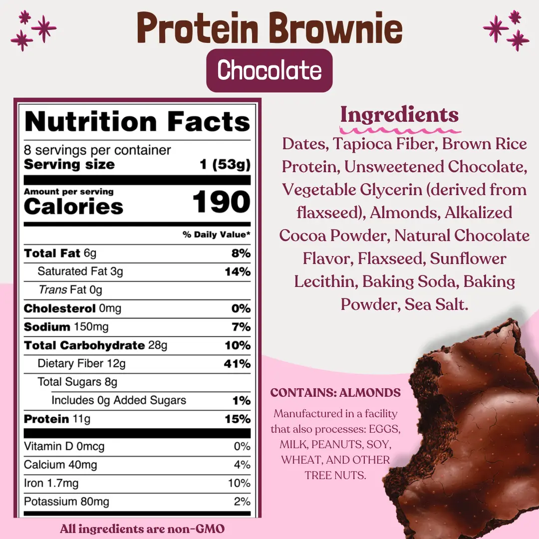 Dates, Tapioca Fiber, Brown Rice Protein, Unsweetened Chocolate, Vegetable Glycerin (derived from flaxseed), Almonds, Alkalized Cocoa Powder, Natural Chocolate Flavor, Flaxseed, Sunflower Lecithin, Baking Soda, Baking Powder, Sea Salt.
