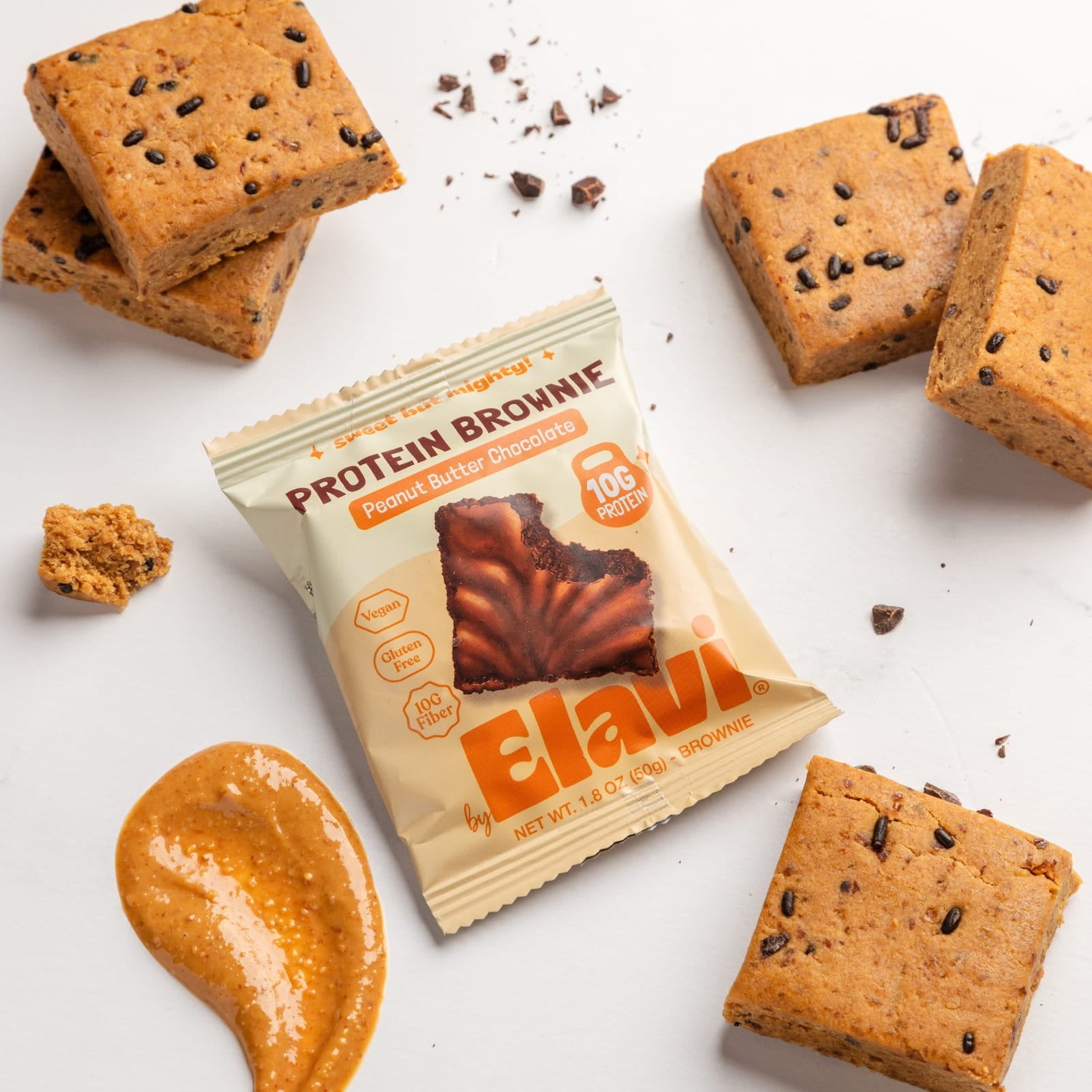 Elavi protein brownies are made with no added sugars and are naturally sweetened with low-glycemic dates. They contain no syrups, refined sugars, or sugar alcohols. The sprinkles used in the Birthday Cake and Peanut Butter flavors contain <1g of sugar per serving, and only a very small amount is used.